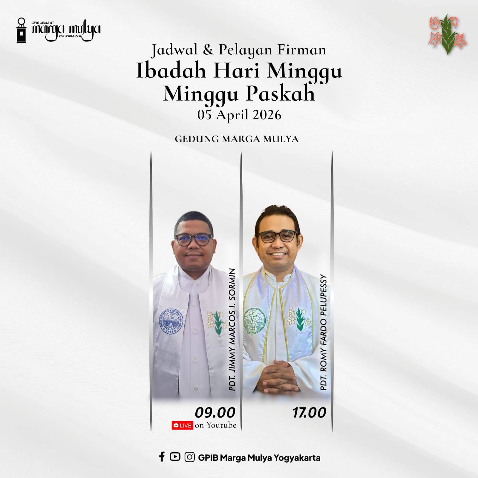 Majelis Jemaat GPIB Marga Mulya Yogyakarta mengucapkan selamat datang dan selamat beribadah kepada Bapak/Ibu/Saudara/i dalam ibadah saat ini, kiranya ibadah dan bakti diri kita menjadi berkat dalam proses perjalanan kehidupan kita.